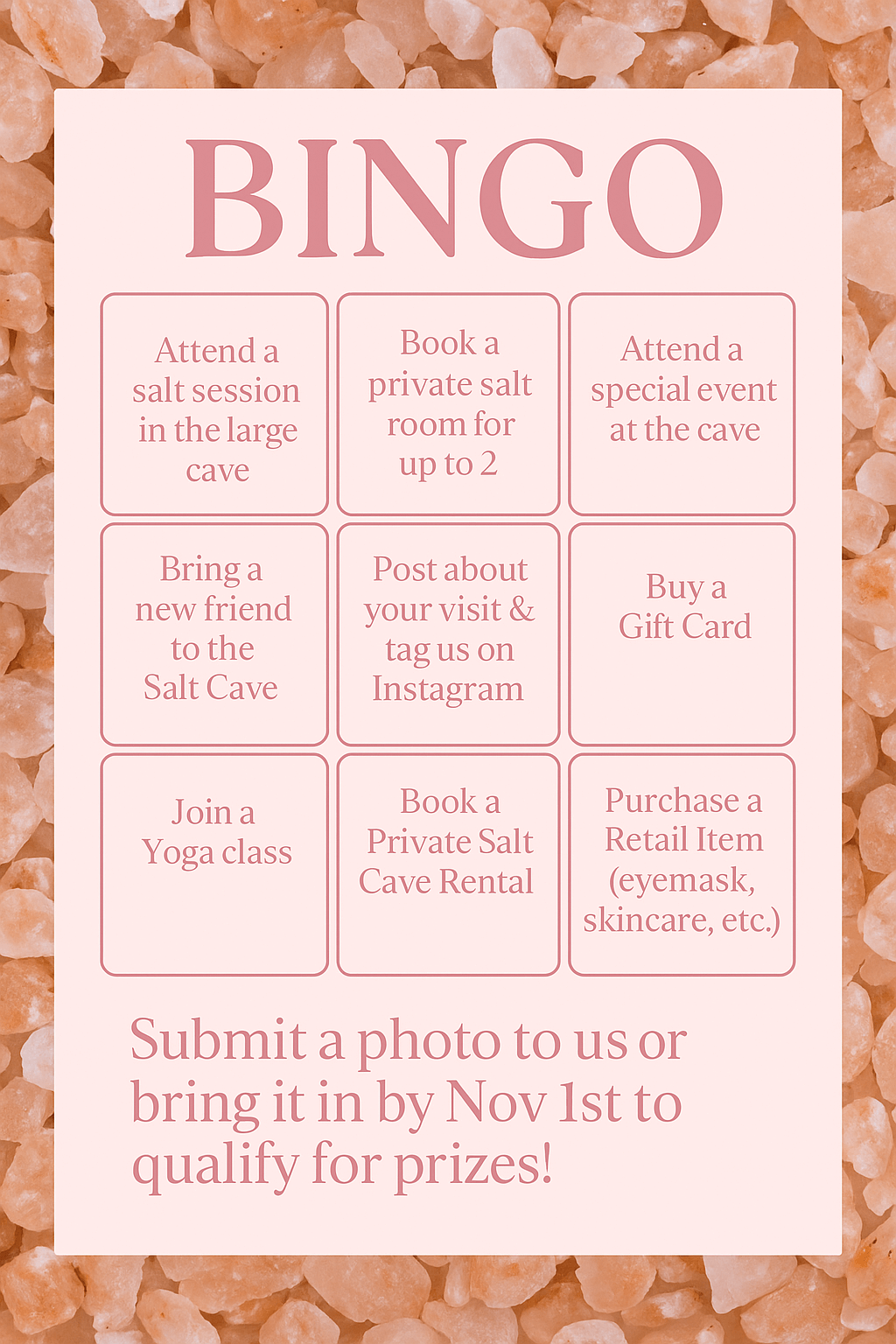 Markings on the bingo card are good for October 15th through October 31st and boxes marked by a staff member. The first five winners can be vallidated at any time once three boxes are checked across, down, and diagonally for their prize. After the first five winners, all qualifying cards will be entered into our grand prize drawing on November 1st.